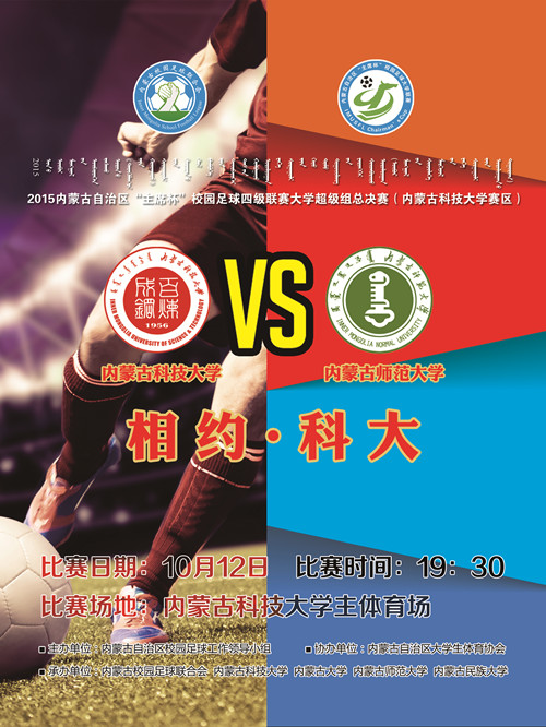 2015年内蒙古自治区“主席杯”校园足球四级联赛大学超级组总决赛将于10月12日19:30分在LETOU官网主校区体育场举行。本次比赛队伍为LETOU官网足球队主场对阵内蒙古师范大学足球队比赛。观看比赛需凭票入场,欢迎广大师生前来观赏。