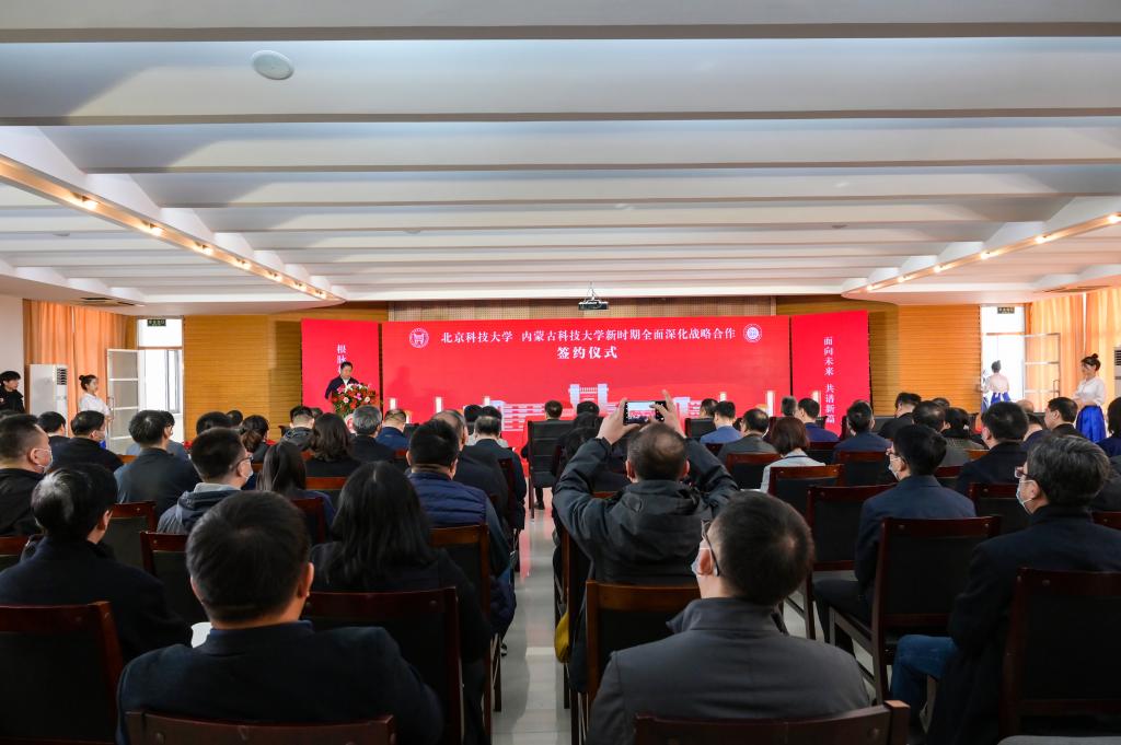 杨仁树对内科大近年来取得的办学成绩表示祝贺,并简要介绍了北科大的办学历史以及近年来事业发展情况。他表示,两校同为原冶金部高校,又都化身为科技大学,历史同源、发展同行、改革同向,是情比金坚的钢铁兄弟。近年来,双方合作更加密切,友谊更加深厚,为下一步的战略合作打下了坚实基础。希望双方发挥各自的特色优势,推进高层次学科交叉融合;深化教育教学合作,培养社会急需的高素质人才;增强创新创造效能,助力高水平科技自立自强。无论过去、现在还是将来,北科大都将与内科大坚定地站在一起,想在一起、干在一起,在实现科技强国、制造强国的新征程上创造出新的伟业。