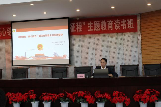 学校马克思主义学院副院长、教授金海斌作题为《深刻领会“两个确立”的决定性意义与实践要求》专题讲座。讲座从准确把握“两个确立”的科学内涵、深刻领会“两个确立”的决定性意义与全面贯彻“两个确立”的实践要求三方面进行讲解,讲座主题鲜明、内涵丰富、对推动主题教育走深走实具有很强的指导性。