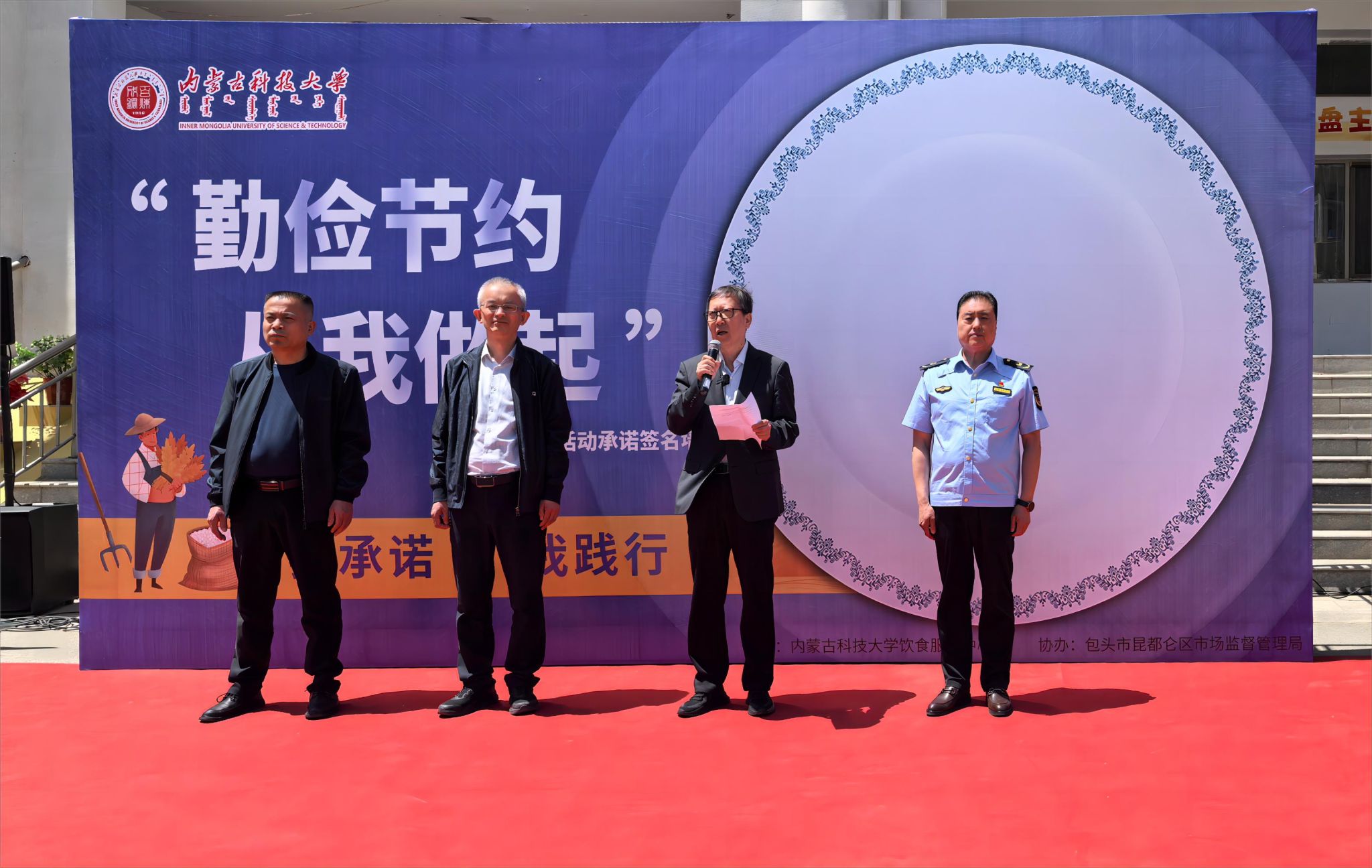 为深入贯彻落实习近平总书记关于制止餐饮浪费行为的重要指示精神,弘扬中华民族勤俭节约的传统美德,5月15日,“勤俭节约,从我做起”光盘活动月启动仪式在颐园餐厅广场正式启动。校党委副书记杨建林,昆都仑区副区长李红宇、市场监督管理局副局长王福虎出席启动仪式。学校各餐厅经理、各学院学生代表和学生权益委员会成员参加了启动仪式。