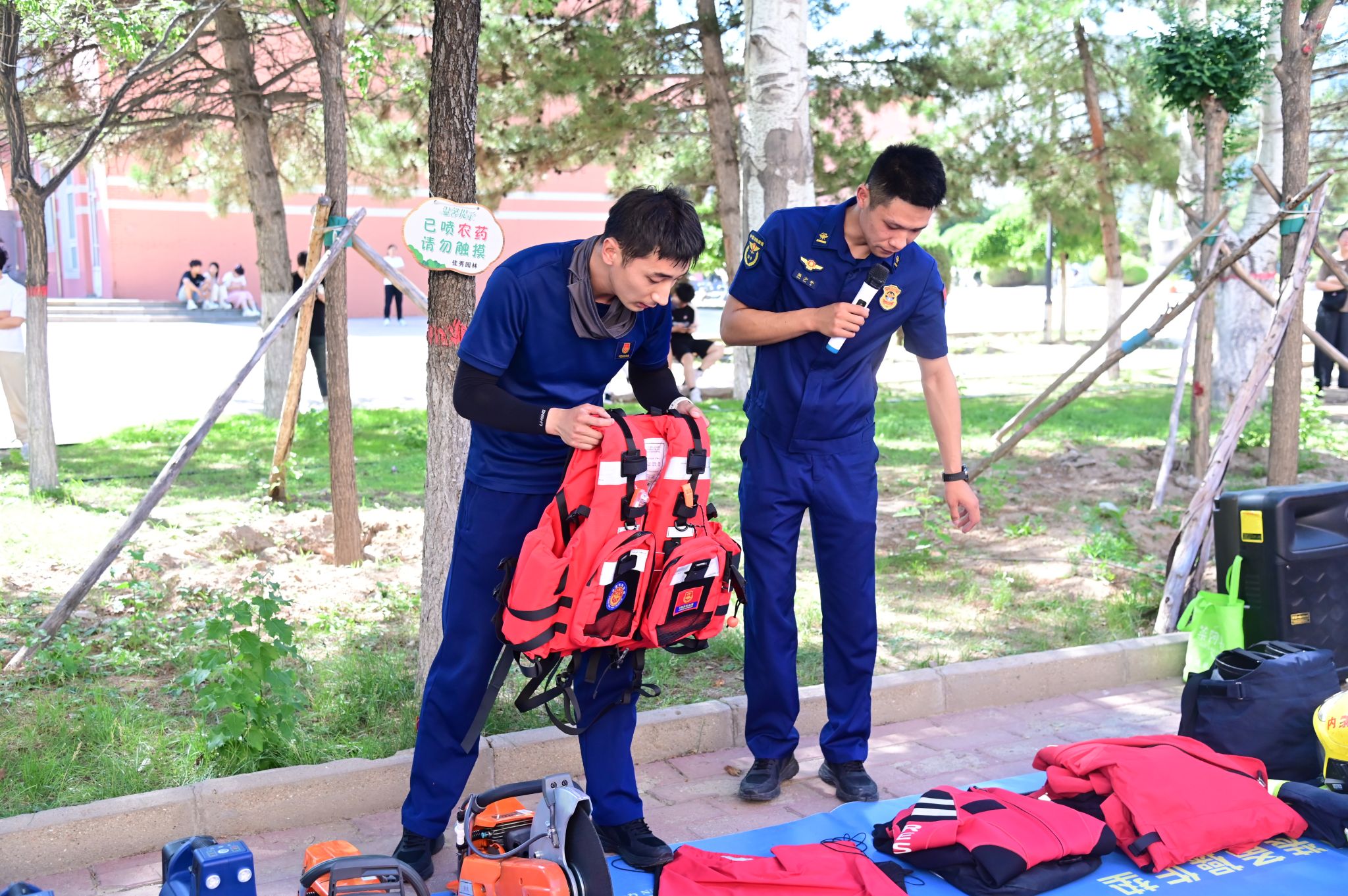 第三环节为消防专业装备的展示与讲解。消防员系统介绍装备的功能、用途及操作方法。师生近距离观察,直观感受消防工作的专业性与复杂性,加深了对消防工作的认识。