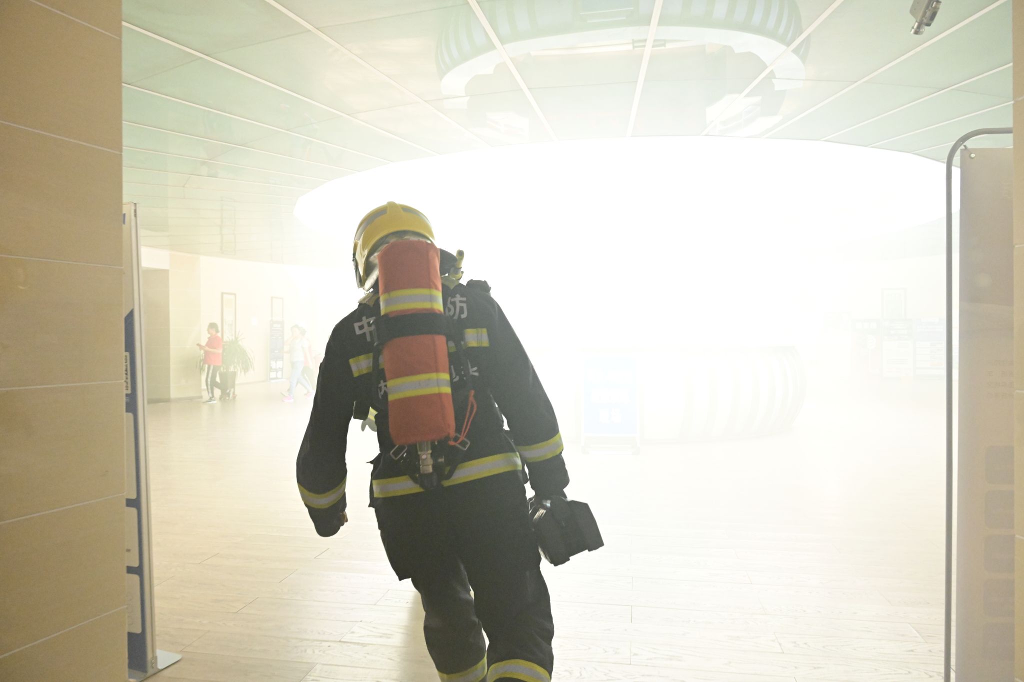 演练共分为三个环节。第一环节为应急疏散与救援。当图书馆消防警报响起后,师生按既定路线弯腰低姿快速有序撤离,工作人员在各重要点位引导疏散;消防员携带灭火装备迅速抵达“起火点”,开展火灾扑救作业,同时对“受困人员”实施搜救转移,全程展现出师生良好应急能力与多方协作的救援效率。