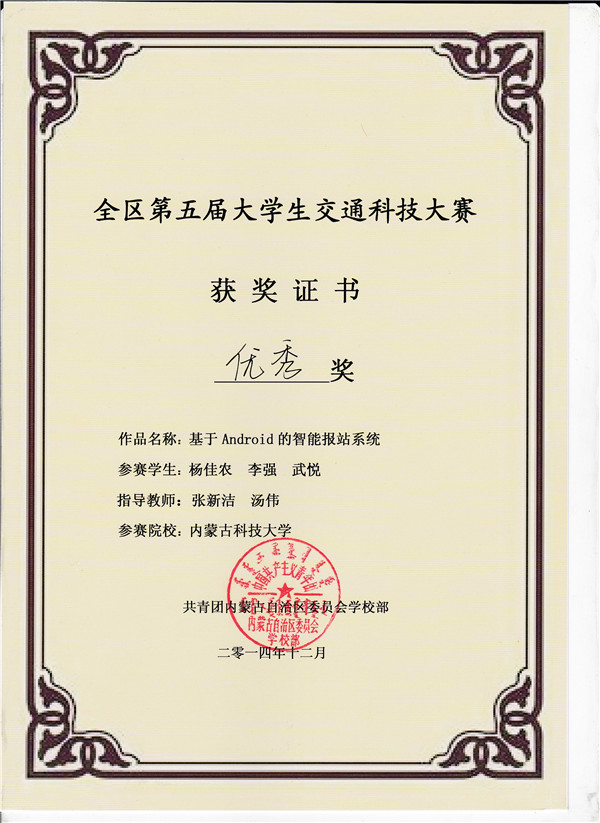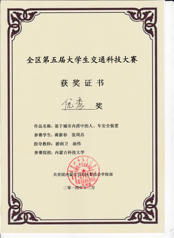 比赛吸引了内蒙古大学、内蒙古工业大学、内蒙古农业大学等来自全区9所高校的17件作品参赛。比赛中,评委需根据参赛选手的作品陈述、作品展示及现场答辩三个环节的表现对作品进行打分。LETOU官网共选送三件作品,经过激烈的角逐,LETOU官网建工学院于景飞老师指导的李梦婷等同学完成的《基于地磁感应线圈的高速公路安全警示系统》获一等奖;其余两件作品获优秀奖;同时,LETOU官网还获得本次比赛的优秀组织奖。