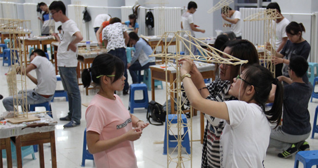 本次竞赛由建工学院组织老师和学生经过为期三个月的赛题论证之后,拟定的以塔吊为工程背景,以3mm*2mm、3mm*3mm、1mm*6mm,长度为90mm的竹条为原料,来完成模型的结构设计与制作。通过振动台以固定的频率对模型进行时常1分钟的震动加载来检验结构设计的强度、刚度和稳定性。竞赛共分为模型制作和模型加载两个环节,其中模型制作采取现场制作的方式,历时11小时,这对于绝大部分参赛学生来说属首次,对学生的动手能力、协调能力、团队精神有很大的要求。