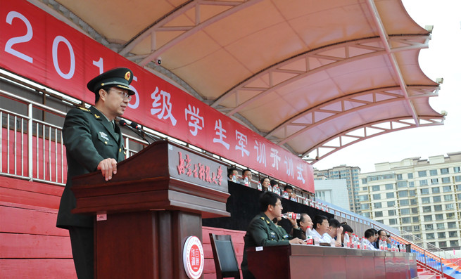 新生军训团政委韩冰、军训团副政委张利敏分别宣布了2015级学生军训团编队及干部名单和关于在2015级本专科生开展评优活动的通知,2015级学生军训团团长马宏乐代表军训教官讲话,他说,希望通过军训提高学生们的国防意识,增强体魄,打下结实的基础,迎接新挑战。