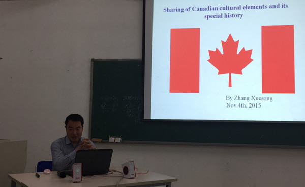 张雪松老师的题目是《Sharing of Canadian Cultural Elements and Its Special History》,他从加拿大独特的文化标志和特殊历史两个方面向师生详细介绍了加拿大的多元文化和历史知识。一方面,他以枫叶,钱币,冰酒,和宗教文化四个方面为切入点讲述了加拿大的多元文化主义的历史渊源,另一方介绍了加拿大历史上欧洲殖民者掠夺土著居民的土地和通过宗教寄宿学校强行同化土著儿童的黑暗历史一面。