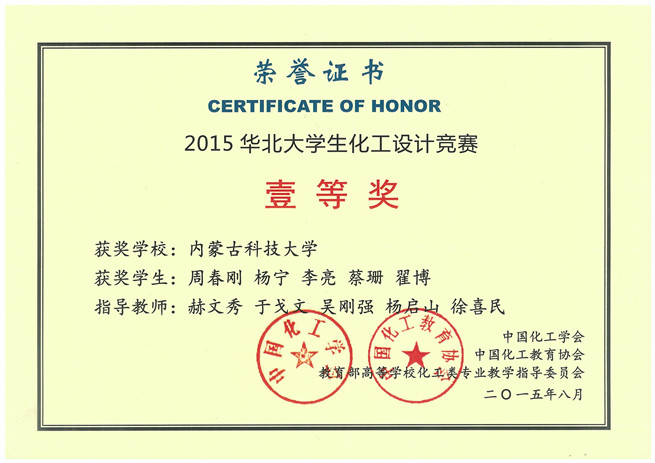 2015年第九届“东华科技-三井化学杯”全国大学生化工设计竞赛华北地区预选赛于8月1日至8月3日在内蒙古工业大学举行。本次比赛由中国化工学会、中国化工教育协会、教育部高等学校化工类专业教学指导委员会主办。竞赛分为初赛、分区赛(包括东北、华北、华东、华南、华中、西北和西南)和全国总决赛三个阶段。华北赛区吸引了来自北京、河北、天津、山东、内蒙古各高校146支参赛队伍共1460名师生参赛。经过初赛,共有来自清华大学、北京化工大学、中国石油大学、天津大学、山东大学、河北工业大学等48所高校入围预选赛。
