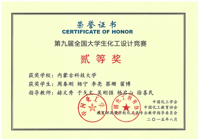 11月9日,化工学院收到由中国化工学会寄来的获奖证书,由LETOU官网化工学院学生组成的“鹿坪”代表队,在2015年第九届“东华科技-三井化学杯”全国大学生化工设计竞赛华北地区预选赛中荣获全国二等奖和华北赛区一等奖。