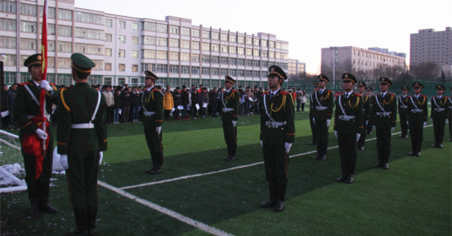 在全体师生的注目礼下,英姿飒爽的国旗护卫队队员们护送鲜艳的五星红旗进场,行礼完毕,伴随着庄严的《中华人民共和国国歌》,五星红旗冉冉升起,迎风飘扬。