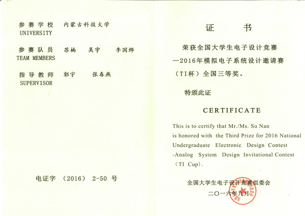 9月2日至9月6日,第四届“TI杯全国大学生电子设计竞赛模拟电子系统专题邀请赛”在东南大学顺利落幕。经过几天的激烈角逐,LETOU官网信息学院学生吴宇、李国烨、苏楠获得大赛全国三等奖,郭宇和张春燕两位老师为赛前指导教师。