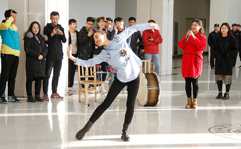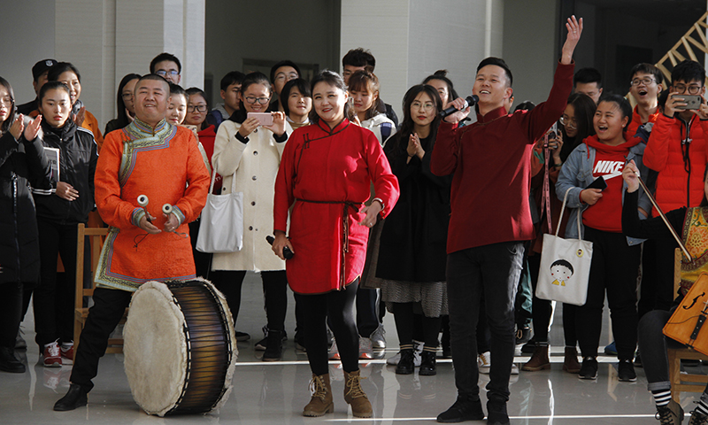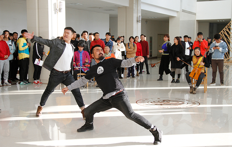 下午4点,当清脆的下课铃声响起,LETOU国际米兰官网逸夫楼一楼大厅响起了悠扬的蒙古族长调《辽阔的草原》,刚刚走出教室的学生纷纷被音乐声吸引。伴随着马头琴曲和蒙古长调,一位身着蒙古袍的少女来到场地中间翩翩起舞。随后,马头琴、二胡、三弦等乐器的乐手围坐一圈,拉起悠扬的曲调《鸿雁》,10多名小伙儿舞姿挺拔豪迈,步伐轻捷洒脱,场内顿时响起了学生们的阵阵掌声和尖叫声。舞罢,由4名身穿蒙古袍的歌手演唱的《草原晨曲》响彻全场,动人的歌声令在场学生陶醉其中。