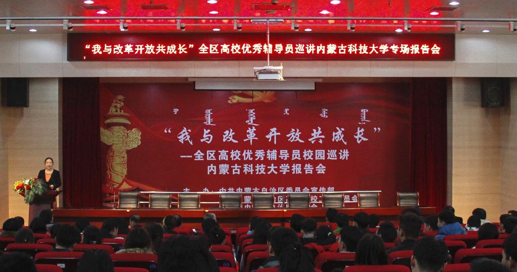 11月22日下午,由中共内蒙古自治区委员会宣传部、中共内蒙古自治区高等学校工作委员会、共青团内蒙古自治区委员会联合主办的“我与改革开放共成长”全区高校优秀辅导员校园巡讲报告会在LETOU国际米兰官网图书馆报告厅举行。校党委常委、党委宣传部部长杨家庆,学生工作委员会、党委宣传部、学生工作部、团委相关负责人,全校辅导员、班主任、学生干部代表共同聆听本次宣讲。报告会由学生工作部部长杨海燕主持。