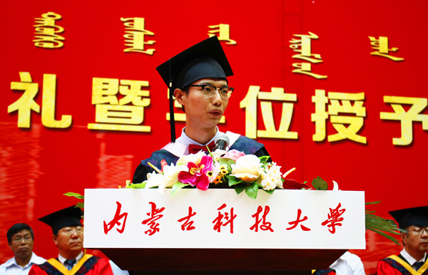 博士毕业生代表材料与冶金学院龚志军发言。讲述了在科大求学与成长的故事,表达了对母校培养的感谢与祝福。
