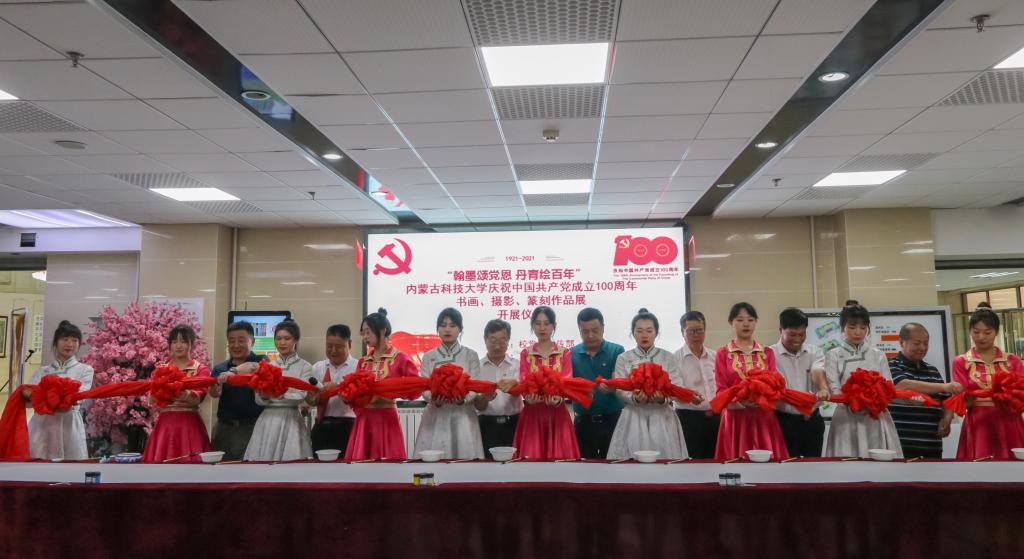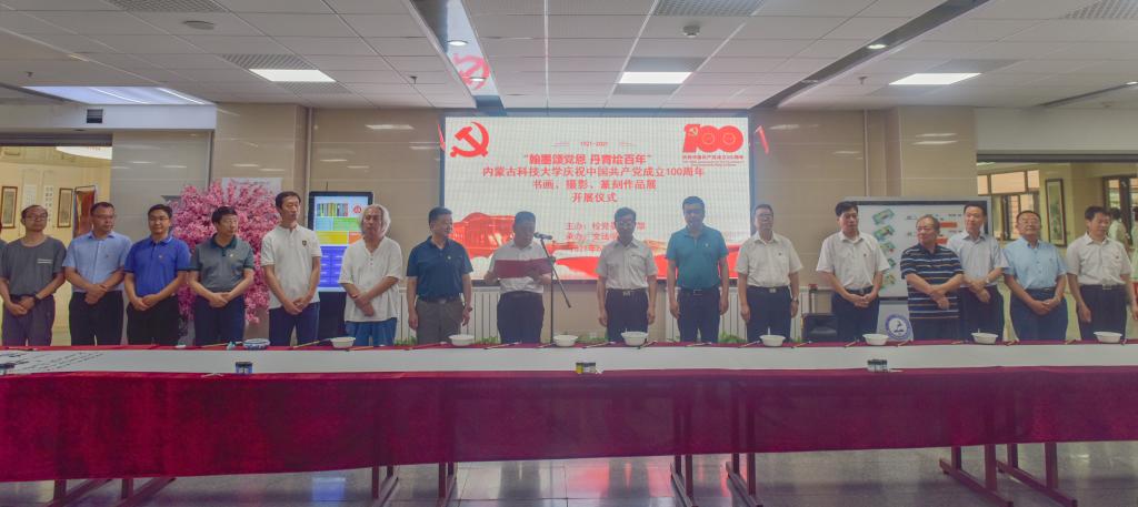 本次展览由校党委宣传部主办、文法学院承办。中国书法家协会会员蔡铁军、王小雷、刘恒军,中国美术家协会会员赵樯、包头老年大学书法教师任建刚,校党政领导共同出席了开幕式。