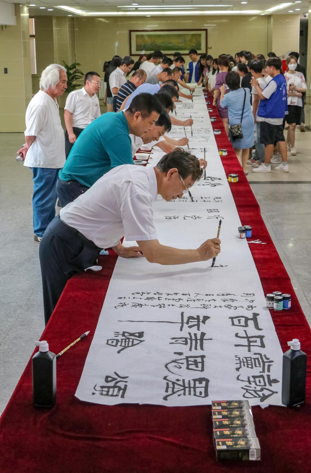 开幕式现场,画家赵樯为本次活动即兴作画,百名师生共同书写百米长卷,以笔墨为党的百年华诞献礼。