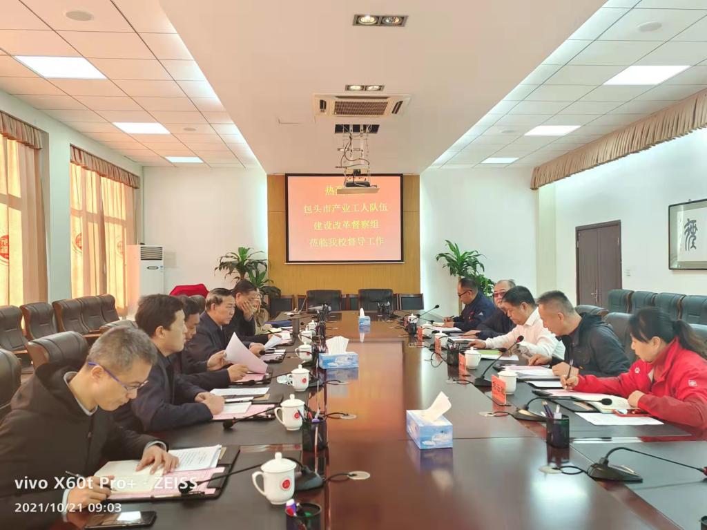 10月21日上午,包头市人大常委会党组副书记、副主任、市总工会主席赵君来校就包头市产业工人队伍建设改革工作中的问题进行督查、交流。包头市委宣传部副部长石秀茹、市人力资源和社会保障局副局长冯国璋、市总工会党组成员米斌、市教育局四级调研员王鹏程、市总工会经济技术部部长尹小梅、市总工会办公室副主任高翔陪同,校党委副书记冯志强,校工会、创新创业教育学院相关负责人出席会议。