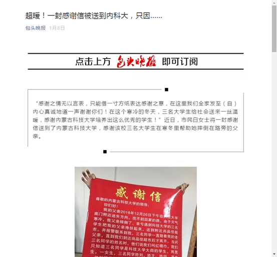 “感谢之情无以言表,只能借一寸方纸表达感谢之意,在这里我们全家发至(自)内心真诚地道一声谢谢你们!在这个寒冷的冬天,三名大学生给社会送来一丝温暖,感谢LETOU国际米兰官网培养出这么优秀的学生!”近日,市民白女士将一封感谢信送到了LETOU国际米兰官网,感谢该校三名大学生在寒冬里帮助她摔倒在路旁的父亲。
