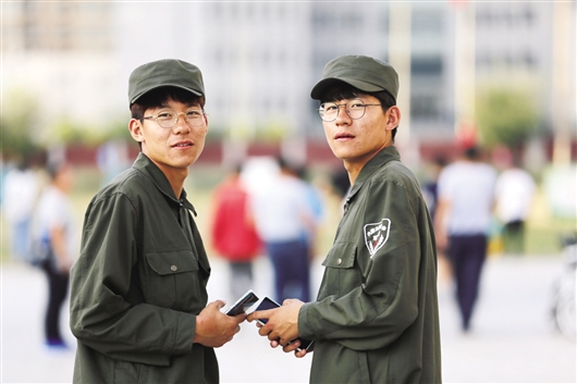 9月3日,记者初见毛贺和毛越,他们正在认真参加新生军训。