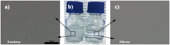 该课题水包油型乳液分离效果图(左侧为乳液的显微照片,右侧为经分离膜处理以后清水的纤维照片,微小油滴已被清除)