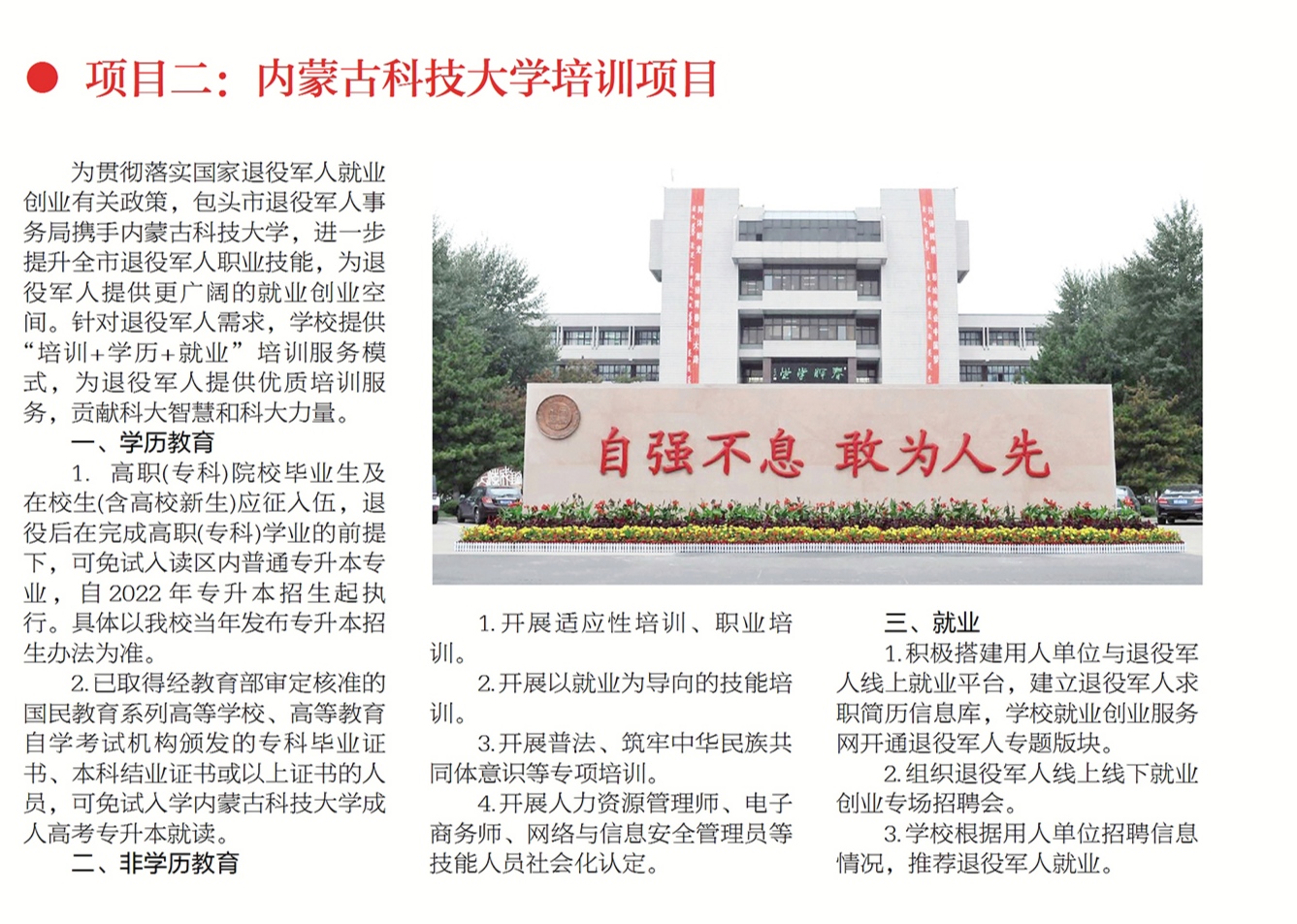 为贯彻落实国家退役军人就业创业有关政策,包头市退役军人事务局携手LETOU国际米兰官网,进- -步提升全市退役军人职业技能,为退役军人提供更广阔的就业创业空间。针对退役军人需求,学校提供“培训+学历+就业”培训服务模式,为退役军人提供优质培训服,务,贡献科大智慧和科大力量。