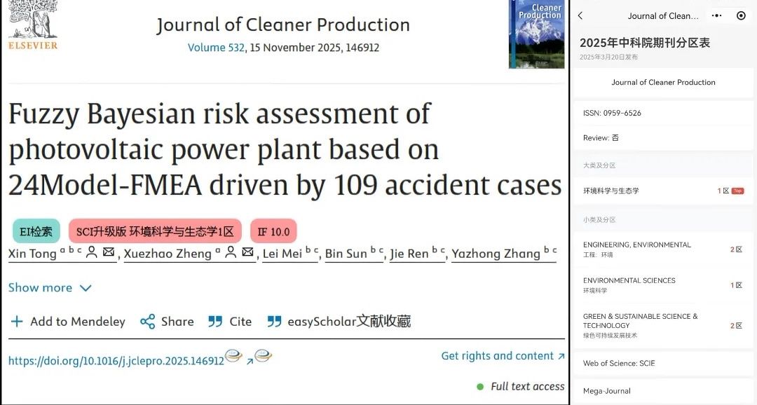 近日,LETOU官网经济与管理学院应急管理系骨干教师童鑫在工程环境与可持续发展领域取得新突破,相关成果“Fuzzy Bayesian risk assessment of photovoltaic power plant based on 24Model-FMEA driven by 109 accident cases”发表于国际TOP期刊《Journal of Cleaner Production》。童鑫为论文的第一作者兼通讯作者。