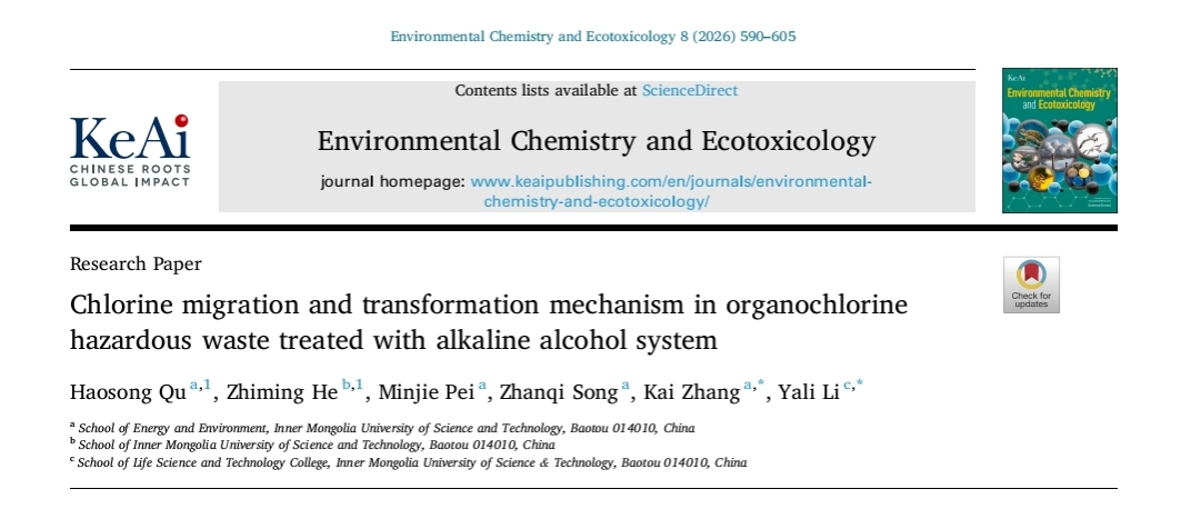 针对强毒性有机危险废物中氯的脱除与分离,研发出了碱-醇反应体系,可高效地将有机物中的氯转化为氯化钠等无机盐,脱氯产物的毒性显著降低,为控制该类有机危险废物在高温热分解过程中含氯污染物的形成创造了先决条件。相关研究成果“Chlorine migration and transformation mechanism in organochlorine hazardous waste treated with alkaline alcohol system”发表在由Keai Publishing出版的开放获取SCI期刊《Environmental Chemistry and Ecotoxicology》上,该期刊聚焦污染物环境化学行为及其生态毒性效应研究。最新影响因子为8.2(2025年),为“中国科学院SCI分区”一区TOP期刊。原文链接:https://doi.org/10.1016/j.enceco.2025.12.010