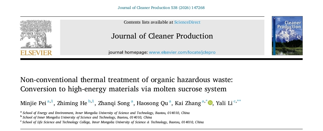 针对有机危险废物组分复杂、形态多样、普遍热值偏低且燃烧性能较差等特点,研发出了熔融糖浴反应体系调控技术,显著提升了其能量密度和爆燃性能。相关研究成果“Non-conventional thermal treatment of organic hazardous waste: Conversion to high-energy materials via molten sucrose system”发表在国际知名环境与可持续发展领域期刊《Journal of Cleaner Production》上,该期刊涵盖了环境科学、工程环境和绿色可持续发展等方面,最新影响因子为10.0,为“中国科学院SCI分区”一区TOP期刊。原文链接:https://doi.org/10.1016/j.jclepro.2025.147268