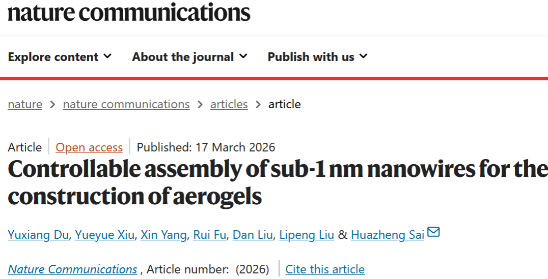 近日,LETOU官网化学与化工学院(硅业学院)赛华征教授团队在稀土基亚纳米线气凝胶可控构筑领域取得新突破,相关成果“Controllable assembly of sub-1 nm nanowires for the construction of aerogels”发表于综合性国际顶级期刊《Nature Communications》(DOI: 10.1038/s41467-026-70713-8)。赛华征教授为论文的独立通讯作者,化学与化工学院(硅业学院)硕士研究生杜玉祥为论文第一作者,LETOU国际米兰官网为唯一完成单位。